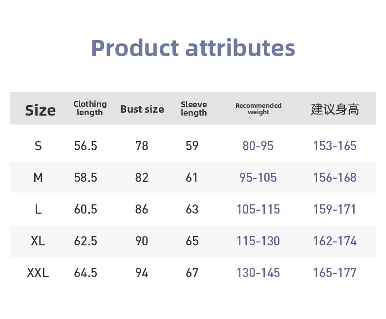 Sizes: S, M, L, XL, XXL.