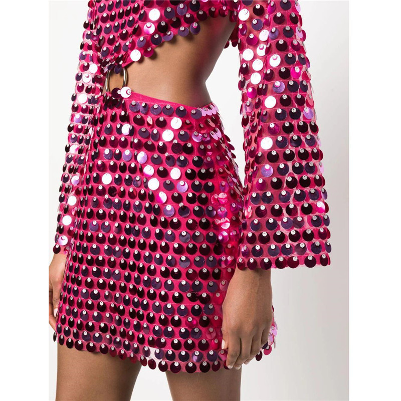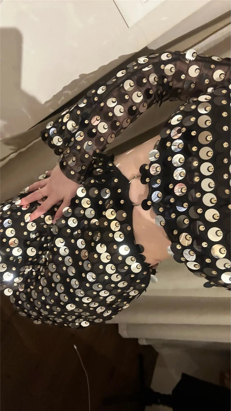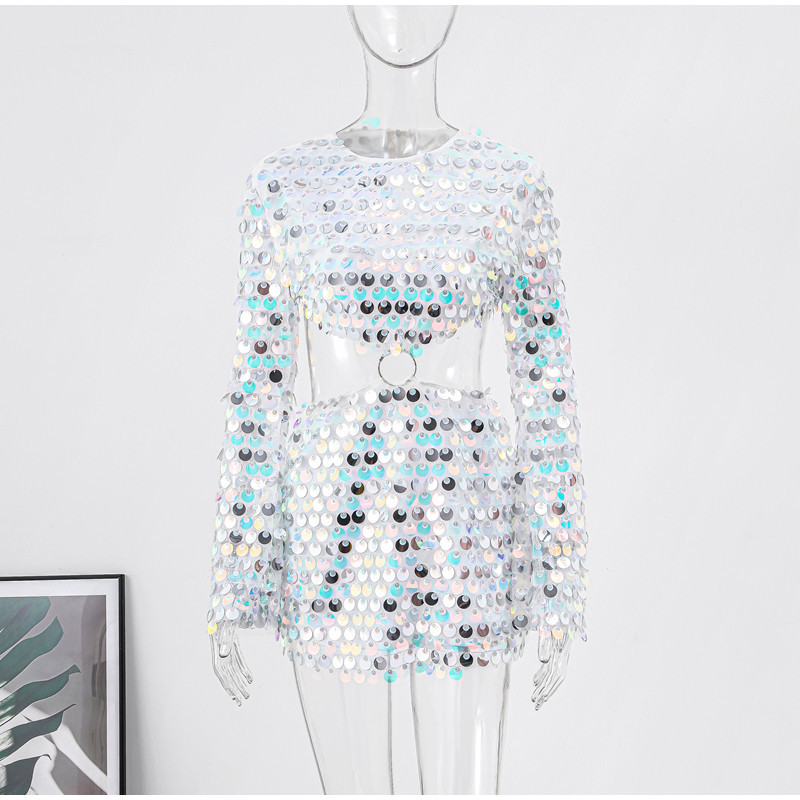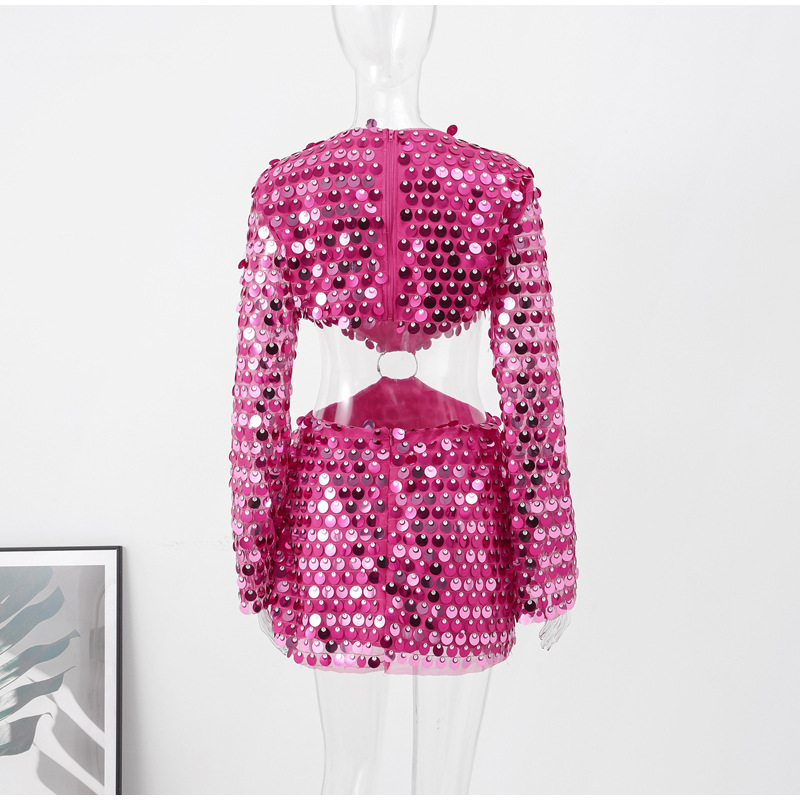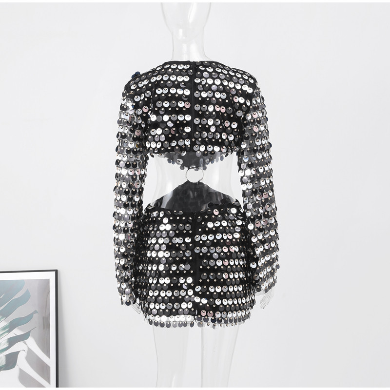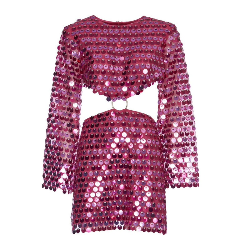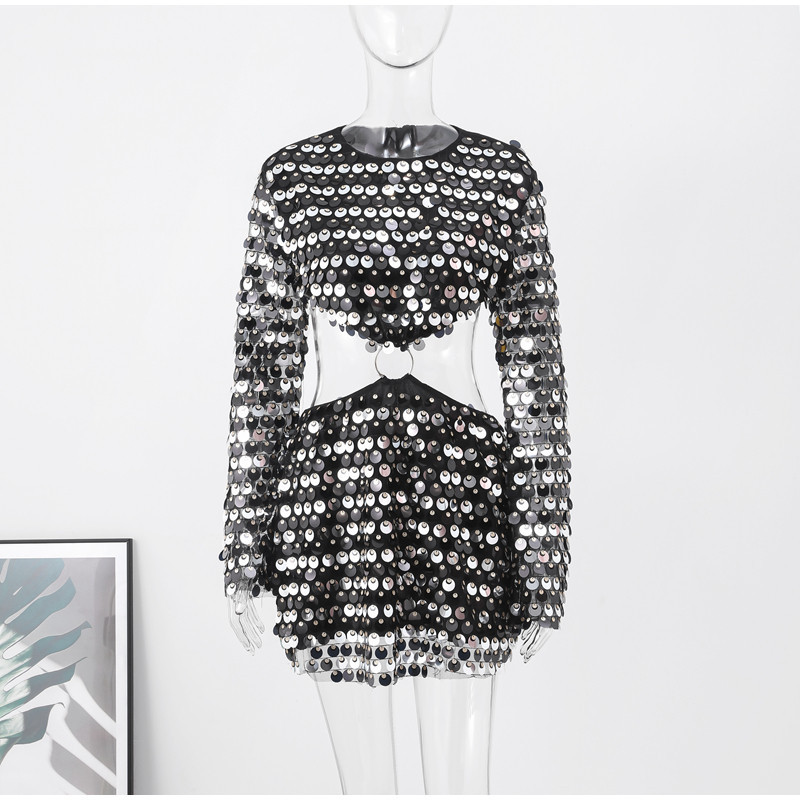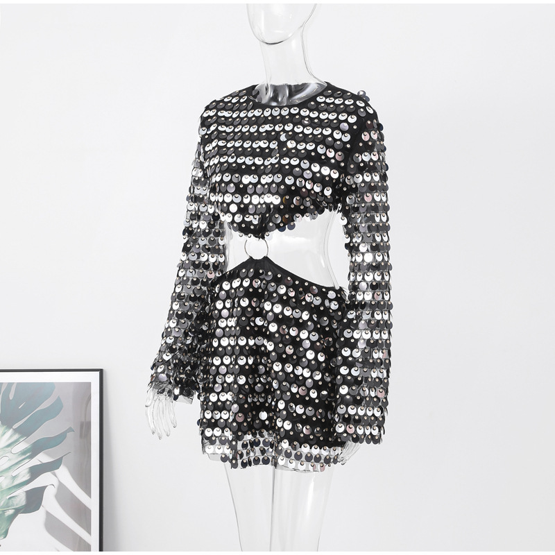 Sexy Design: Long sleeve hollow-out dress with sequins for a bold and stylish look.
