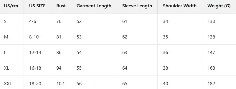 Sizes: S, M, L, XL, XXL.