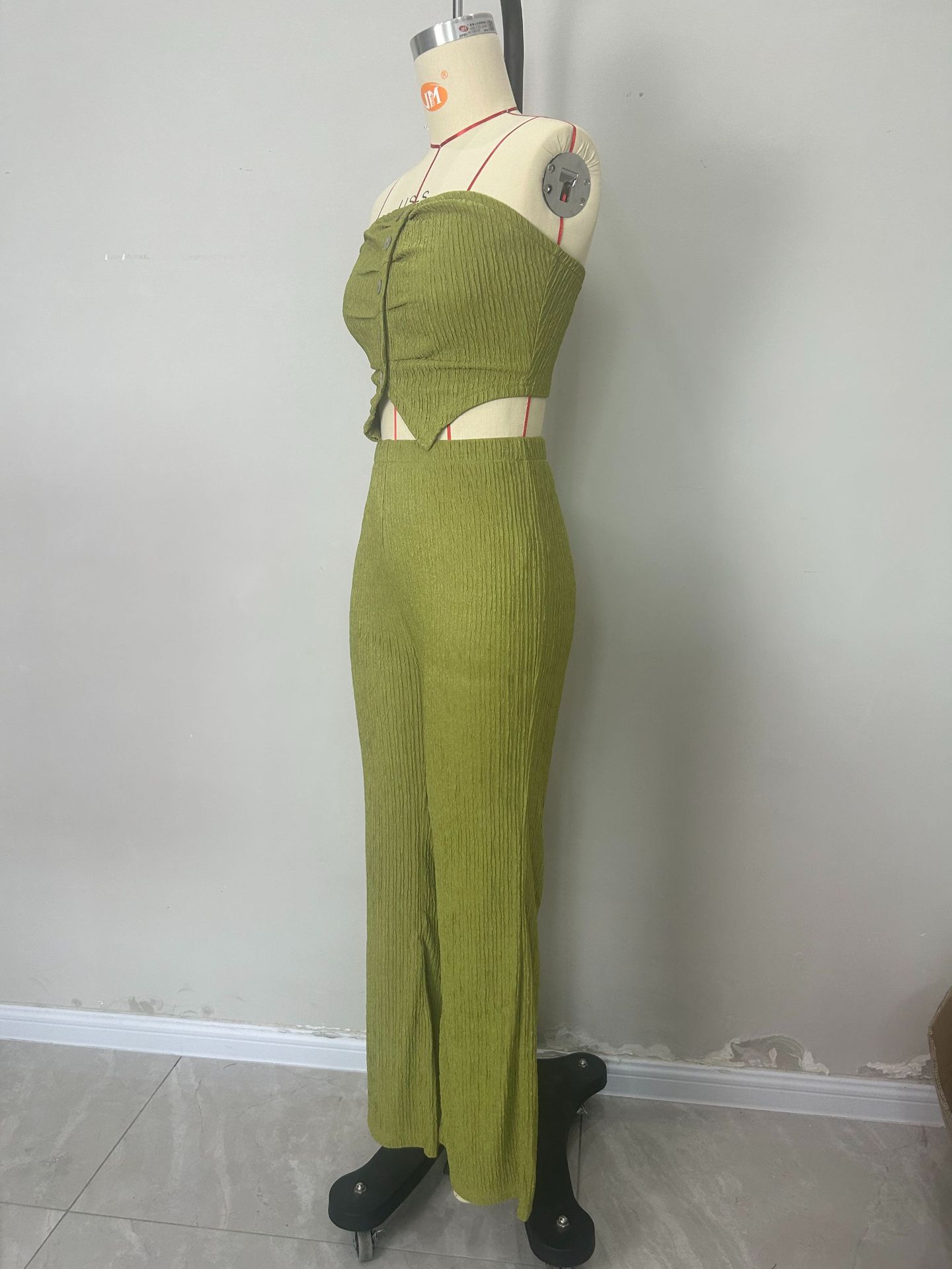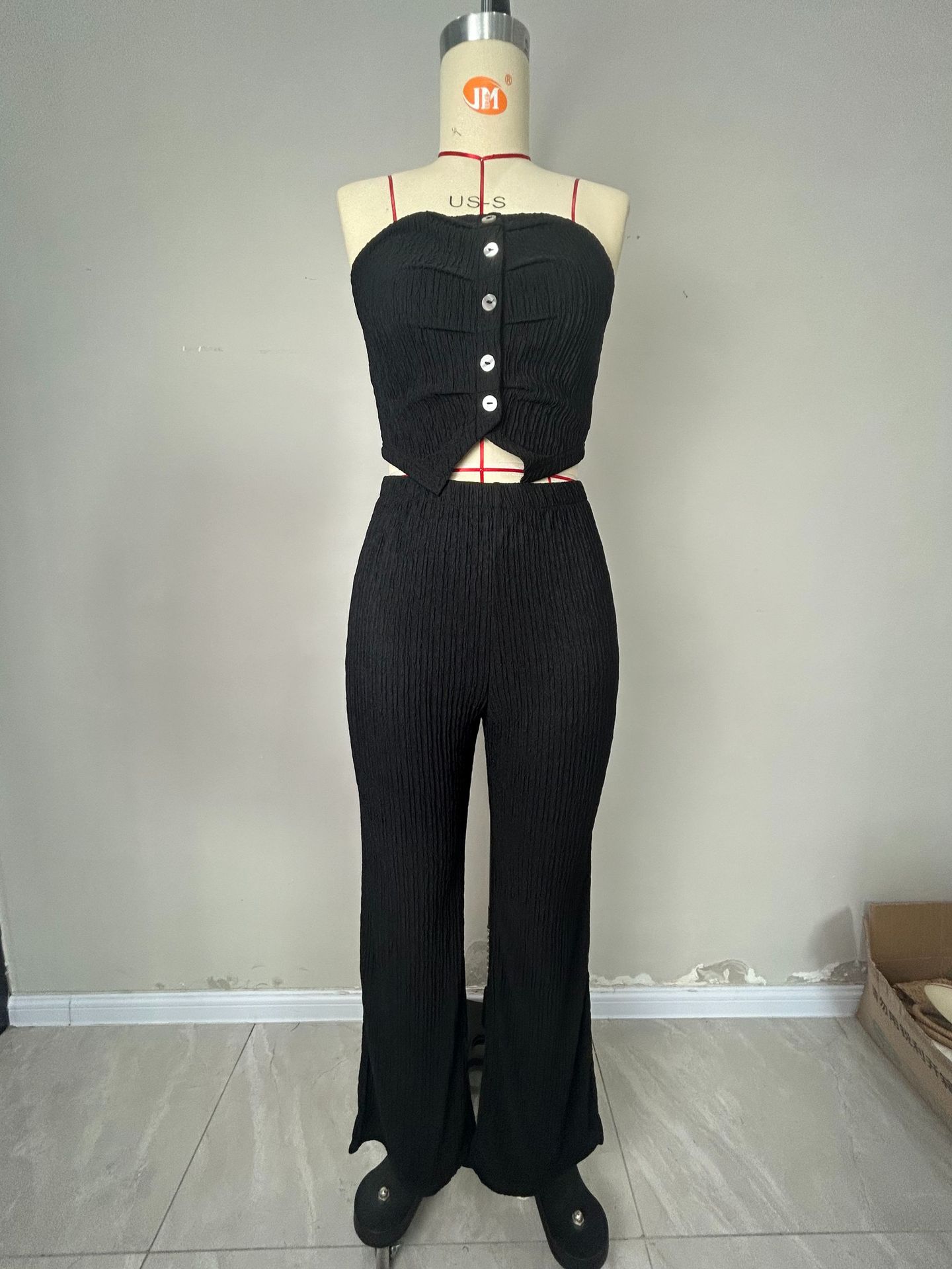 Elegant design: Flared trousers and strapless top create a sophisticated look.