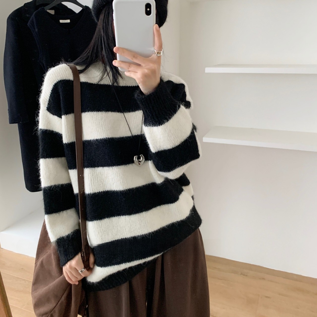 Women’s pullover sweater made from an acrylic fiber and spandex blend fabric. Designed with a loose fit and mid-length cut, this sweater features a striped pattern, round neckline, and long sleeves. The construction supports everyday wear with a solid structure suitable for casual use.