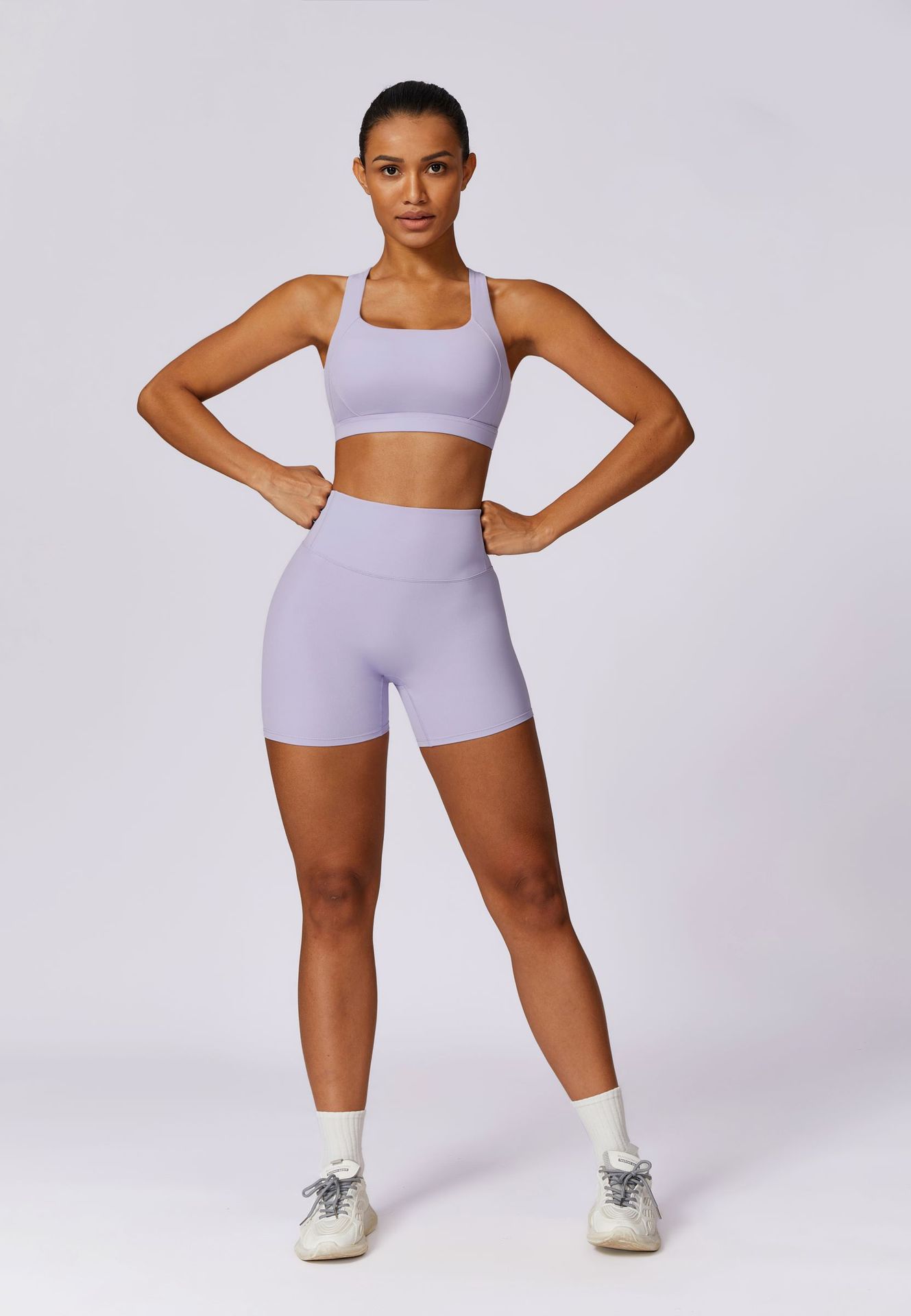 Women’s activewear set made from a polyester and spandex blend fabric. Designed with a seamless construction and sleeveless pullover vest, paired with matching shorts. The fabric provides stretch and breathability for regular movement. Suitable for general fitness, yoga, and everyday active use. Available as a two-piece set or as separate items.